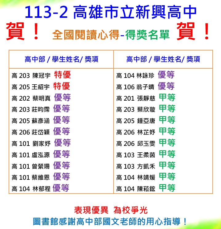 113學年度全國閱讀心得比賽獲獎名單